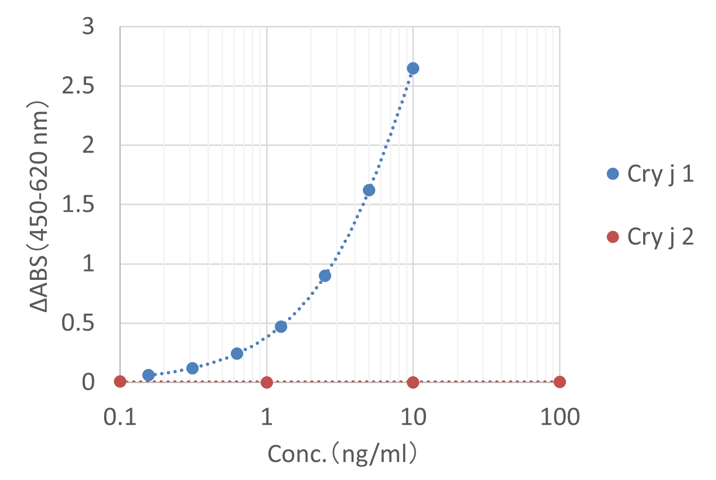 Cry j 1 was specifically measured and Cry j 2 (0.1、1、10、100 ng/mL) was no cross with in this assay.