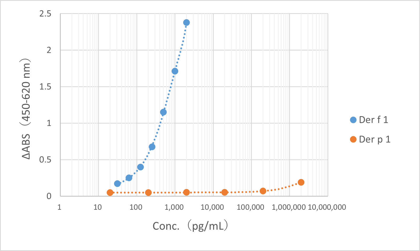 Der f 1 was specifically measured and Der p 1(0.4、4、40、400、4000 ng/mL) was no cross with in this assay.