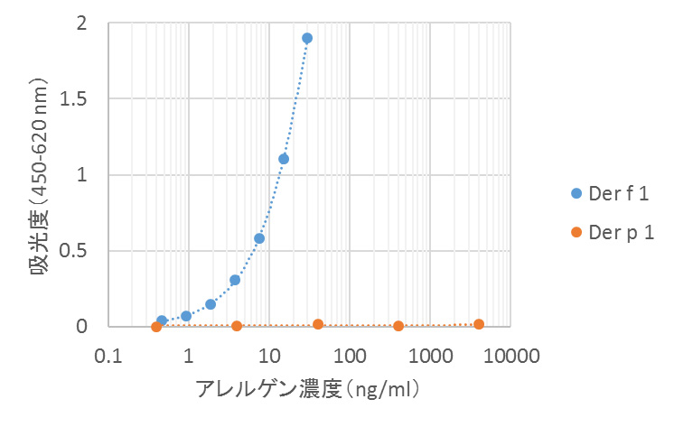 本ELISAにおいては、Der p 1(0.4、4、40、400、4000 ng/mL)に対する反応は認められず、Der f 1を特異的に測定できることが確認された。