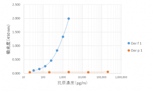 本ELISAにおいては、Der p 1(0.4、4、40、400、4000 ng/mL)に対する反応は認められず、Der f 1を特異的に測定できることが確認された。