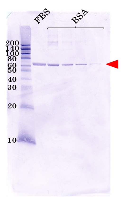 サンプル:FBS, BSA (0.5, 0.25, 0.125, 0.0625 µg/レーン)
